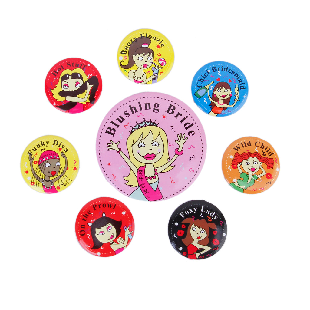 - 8 pieces of funny statement badges for bachelorette parties.