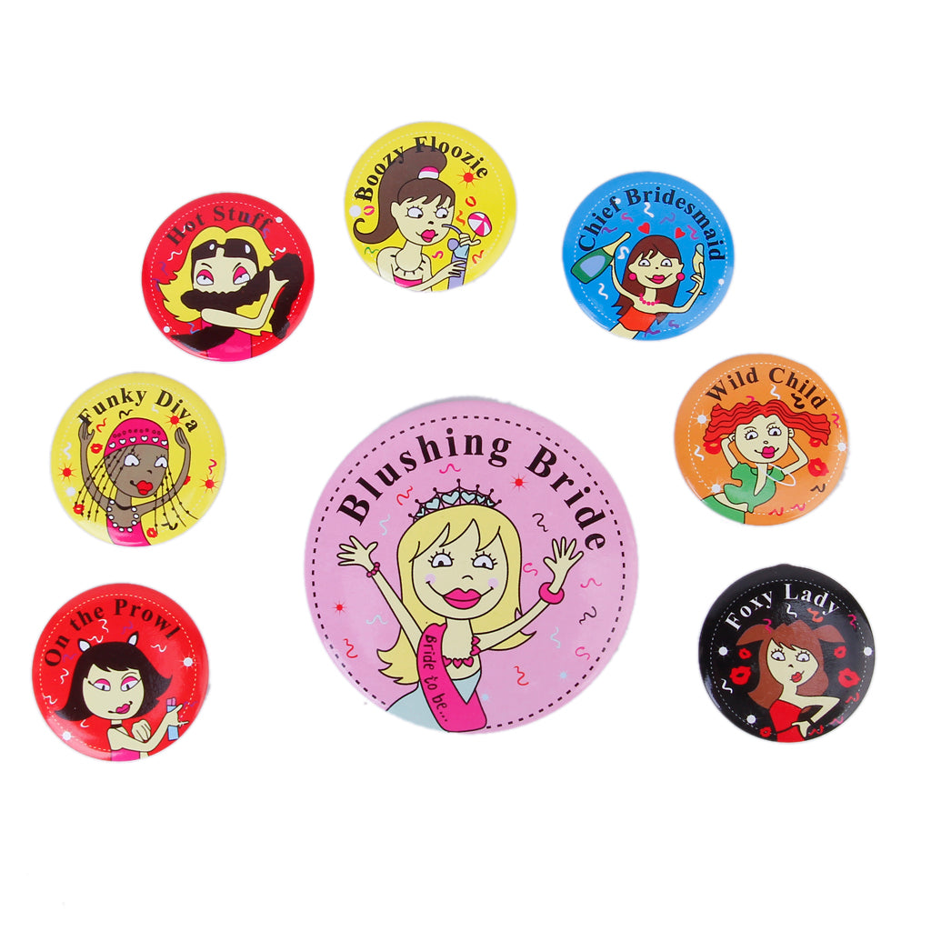 - 8 pieces of funny statement badges for bachelorette parties.  - Diameter of approximately 7.5cm / 3 inches. - Made in iron material.      This item is NOT sold in stores!...